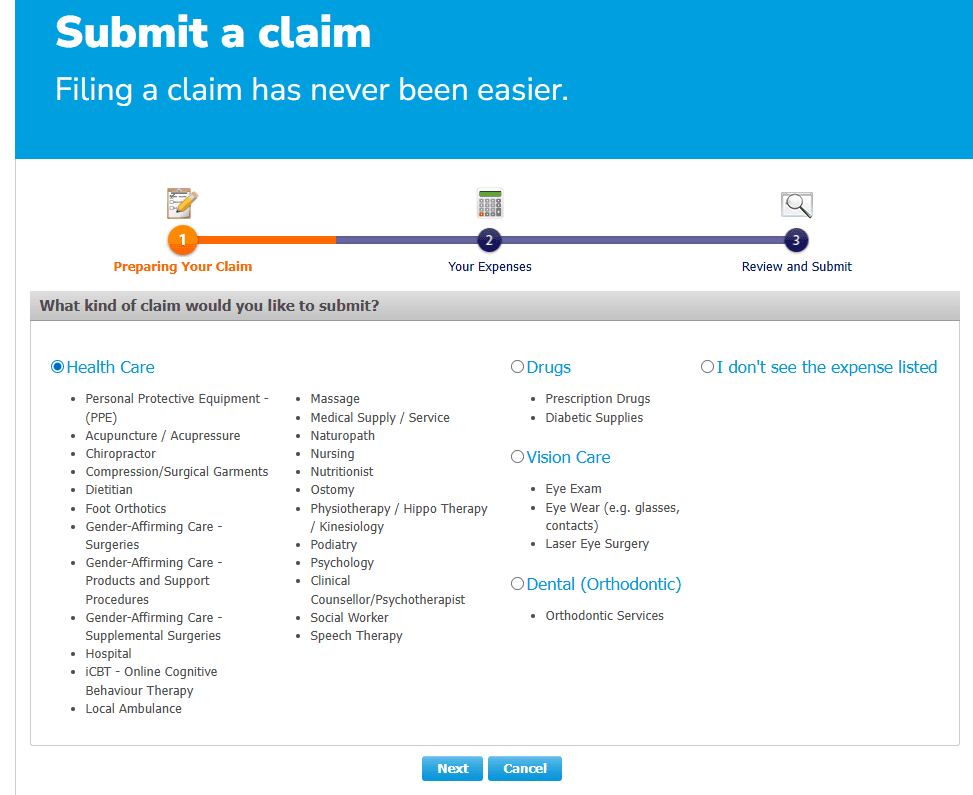 This begins the process of doing a self-submission claim on health care services. Select the appropriate category, which would be "Health Care" for Physiotherapy, Registered Massage Therapy, etc.