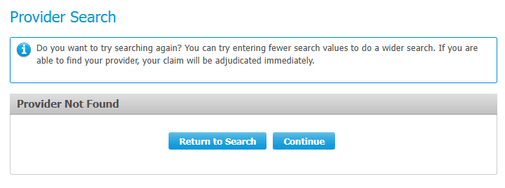 Since we are not on the directory, you won't be able to locate us via the "Search for a Provider" window. Oh no! This will prompt the "Can't Find My Provider" button at the bottom of the screen to move to the next step.