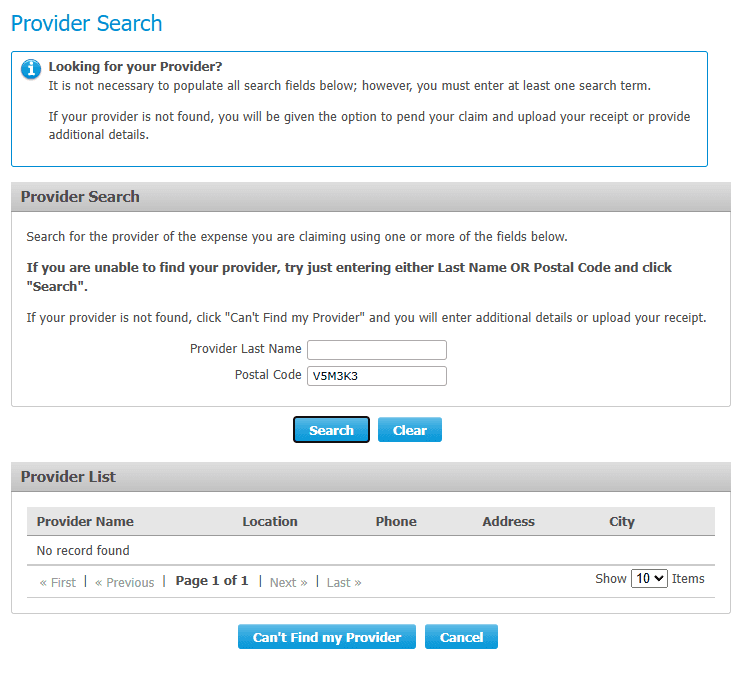 Step 3: Click "Can't Find My Provider" when you fail to locate us with the postal code "V5M 3K3"